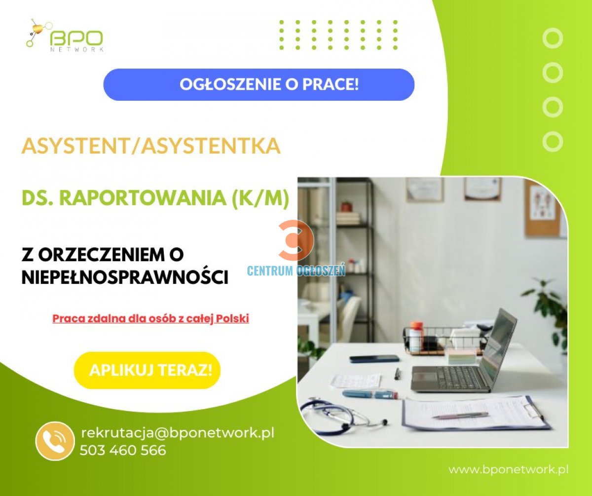 Asystent/Asystentka ds. raportowania (K/M) z orzeczeniem o niepełnosprawności - praca zdalna dla osób z całej Polski