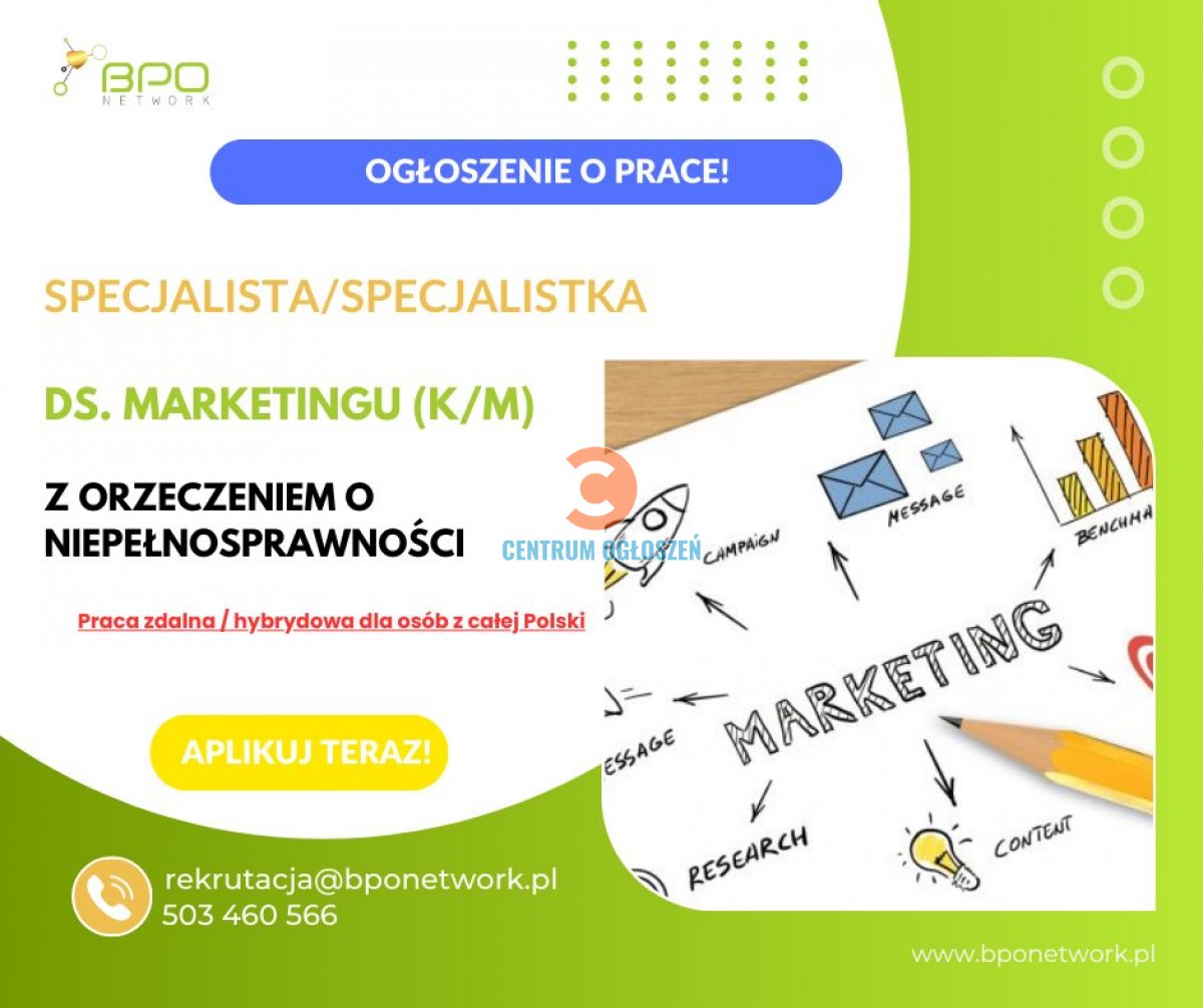 Specjalista/Specjalistka ds. marketingu z orzeczeniem o niepełnosprawności -praca zdalna/hybrydowa dla osób z całej Polski